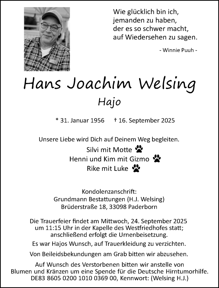 Wer Hajo auf seinem letzten Weg begleiten möchte, ist seitens der Familie herzlich dazu eingeladen: Die Beisetzung erfolgt am kommenden Mittwoch um 11:15 Uhr auf dem Westfriedhof in Paderborn.